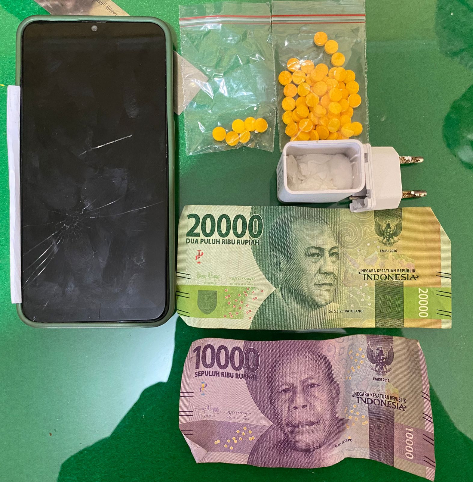 Anom menjelaskan dari penggeledahan itu dari tangan pelaku ditemukan 6 (enam) butir obat warna kuning berlogo “MF’ yang tersimpan dalam Casing charger warna putih. Kemudian 57 butir obat warna kuning berlogo “MF” yang terbungkus tissue.