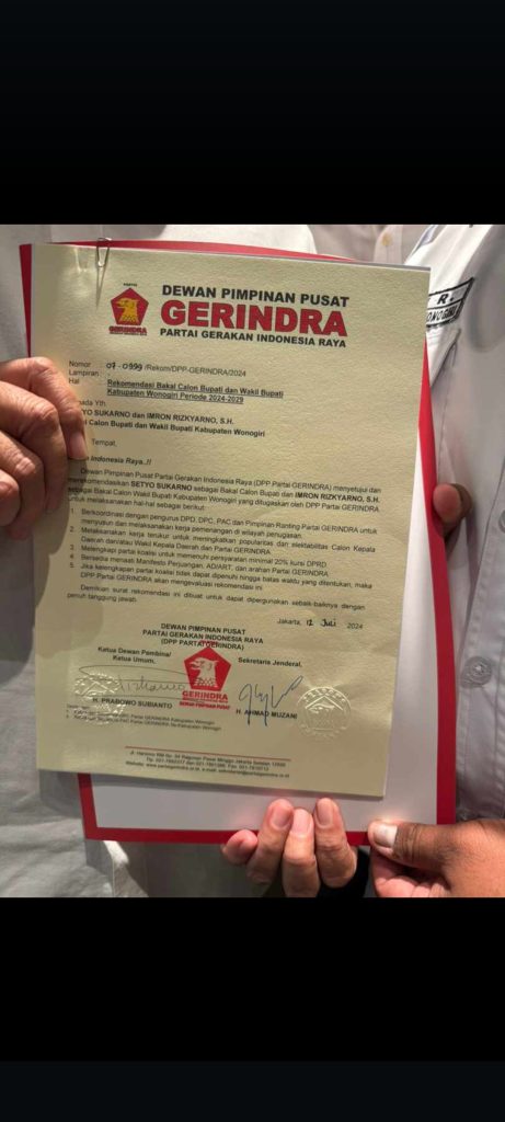 Wonogiri-kabarwonogiri.com- Partai Gerindra telah mengeluarkan rekomendasi pasangan calon kepala daerah Kabupaten Wonogiri,Kamis(1/8).Partai bersimbol burung Garuda itu resmi mengusung Calon Bupati (Cabup) Setyo Sukarno dan Imron Rizkyarno sebagai Calon Wakil Bupati (Cawabup) Wonogiri.