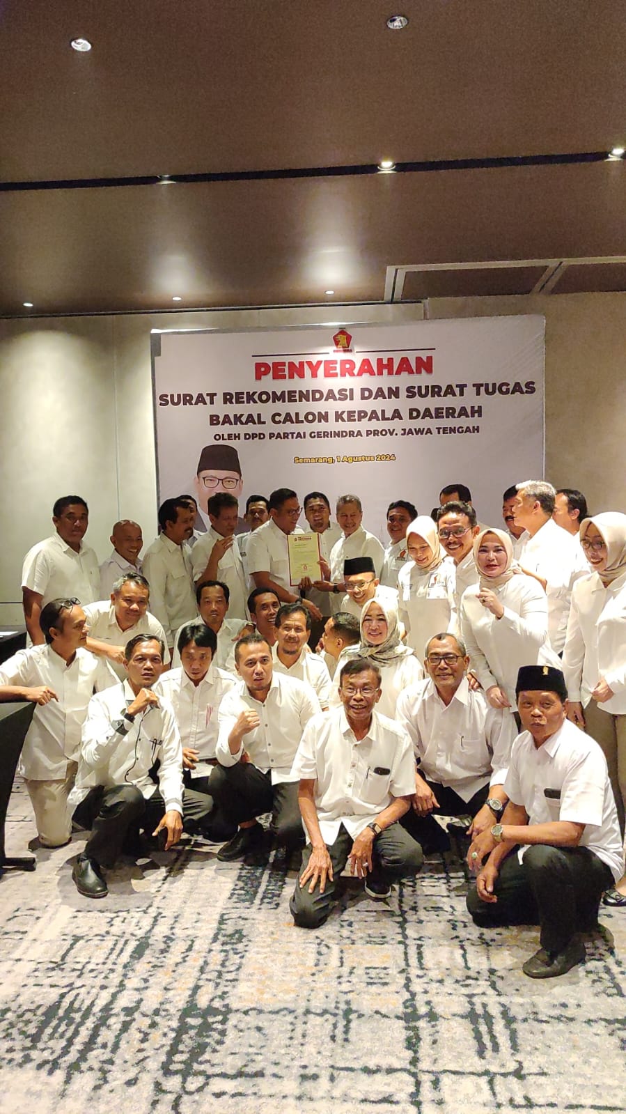 “Sudah dapat rekomnya. Tadi diserahkan Ketua DPD Gerindra Jawa Tengah Pak Sudaryono yang juga Wamen Pertanian,” ujar Setyo Sukarno.