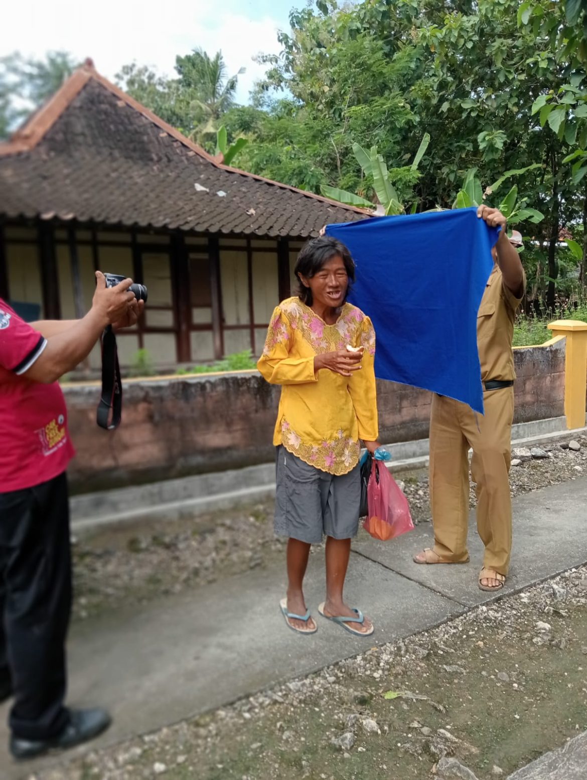 Dalam video yang beredar, pengambilan pas foto itu dilakukan di jalanan desa. Warga yang akan diambil pas fotonya tak mau berhenti, melainkan terus berjalan sambil memakan gorengan.